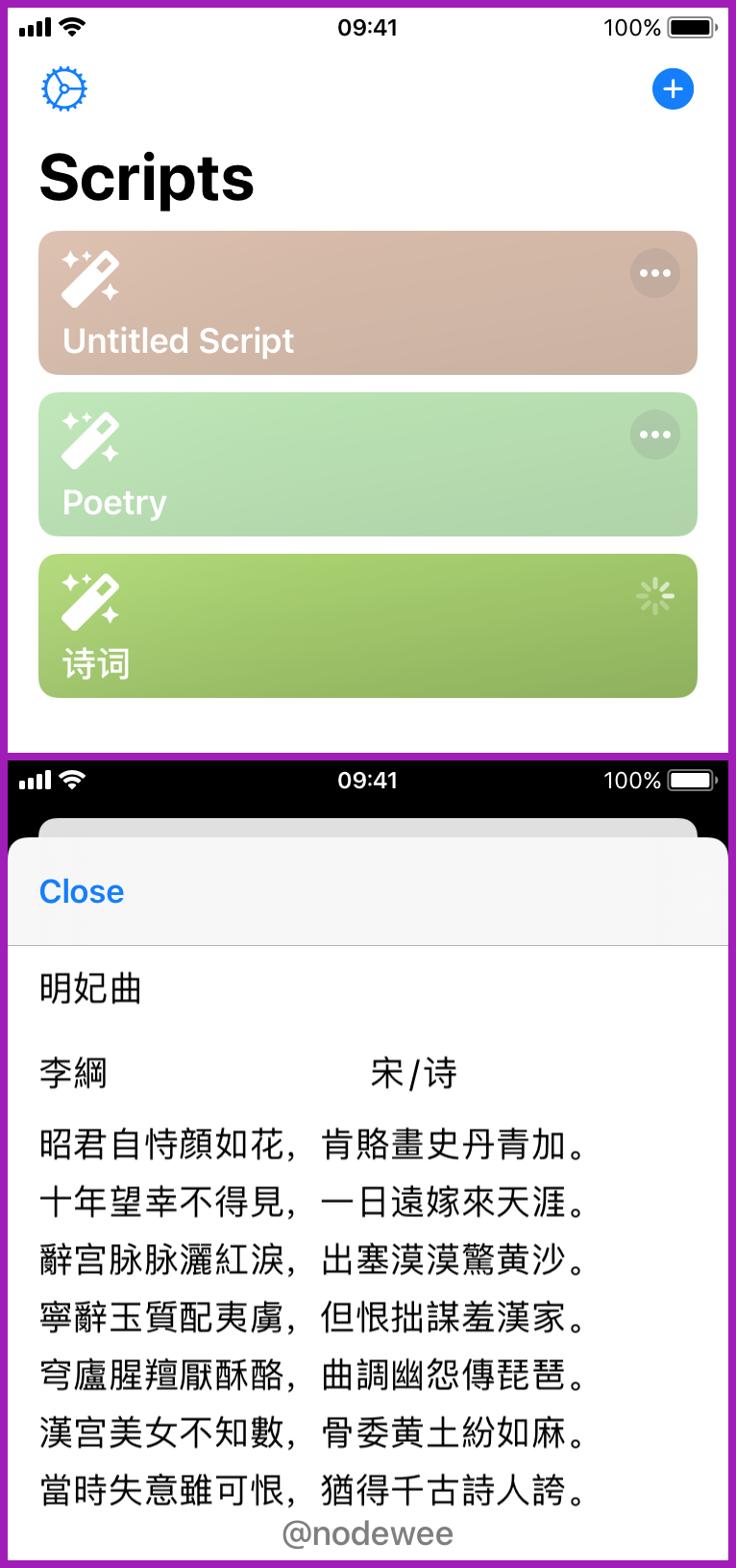 4,「Script」选择刚才我们添加的“诗词”脚本,点击桌面空白处返回。搞定。