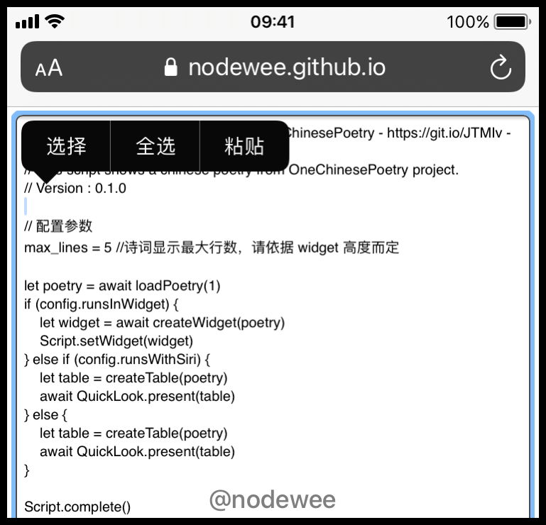 1,在手机上点开这个➦脚本代码的网页,点击代码文本框,全选,复制。